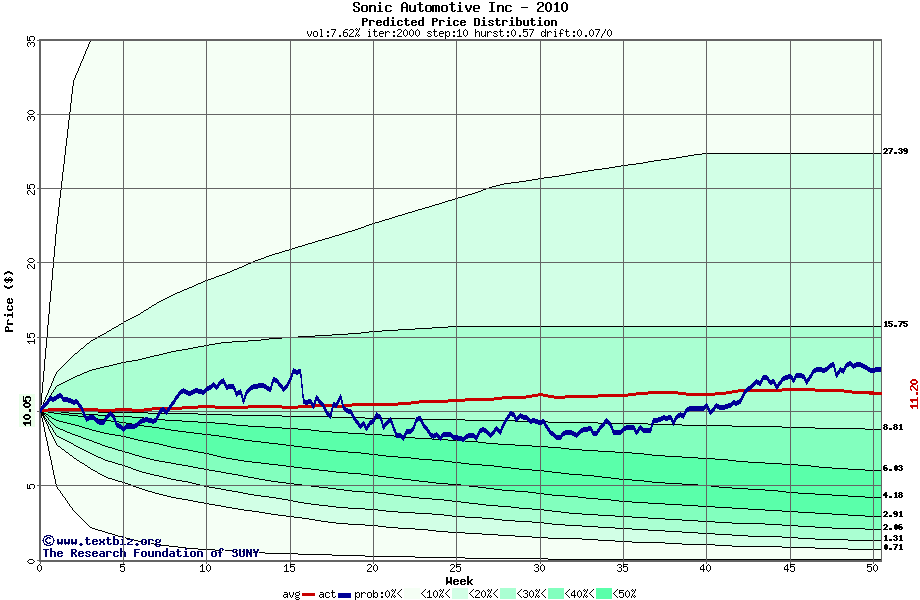 The following graph plots the year-to-date performance of the stock for 2010 compared to the probability calculated by a random walk model.