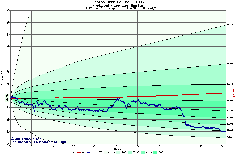 The following graph plots the year-to-date performance of the stock for 1996 compared to the probability calculated by a random walk model.