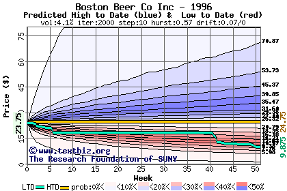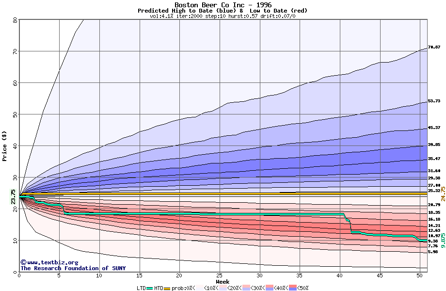 The high to date and low to date prices of the stock plotted against a random walk model for 1996 (what's this?).