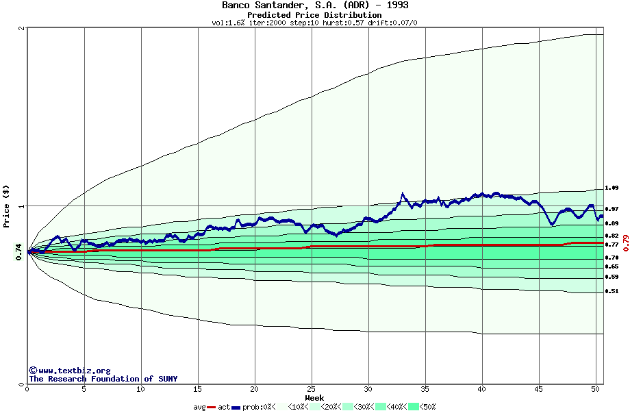 The high to date and low to date prices of the stock plotted against a random walk model for 1993 (what's this?).