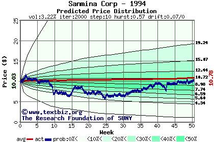 The high to date and low to date prices of the stock plotted against a random walk model for 1994 (what's this?).