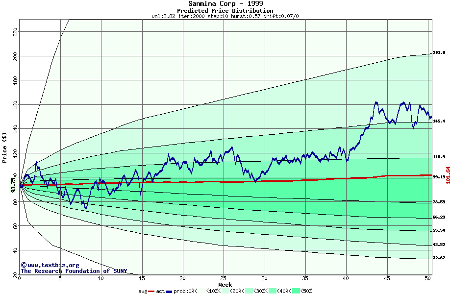 The following graph plots the year-to-date performance of the stock for 1999 compared to the probability calculated by a random walk model.