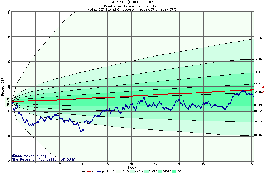 The following graph plots the year-to-date performance of the stock for 2005 compared to the probability calculated by a random walk model.