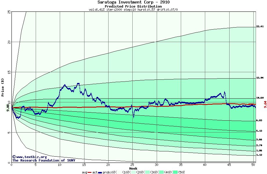 The following graph plots the year-to-date performance of the stock for 2010 compared to the probability calculated by a random walk model.