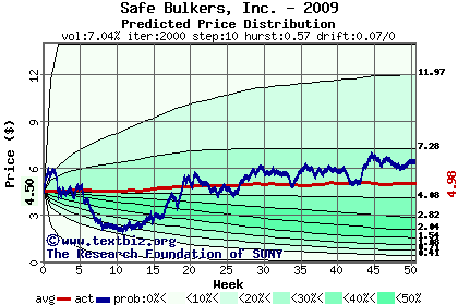 The high to date and low to date prices of the stock plotted against a random walk model for 2009 (what's this?).