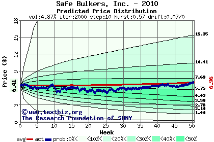 The high to date and low to date prices of the stock plotted against a random walk model for 2010 (what's this?).
