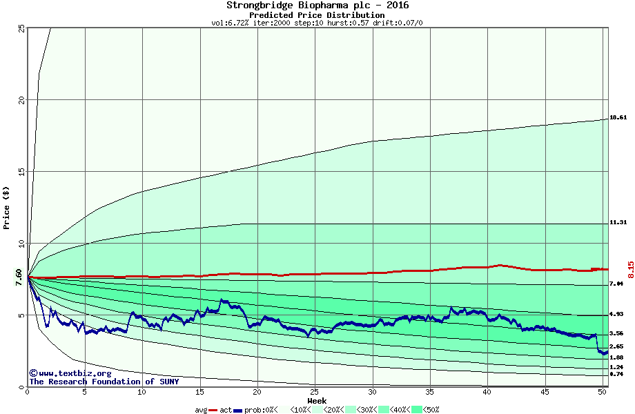 The high to date and low to date prices of the stock plotted against a random walk model for 2016 (what's this?).