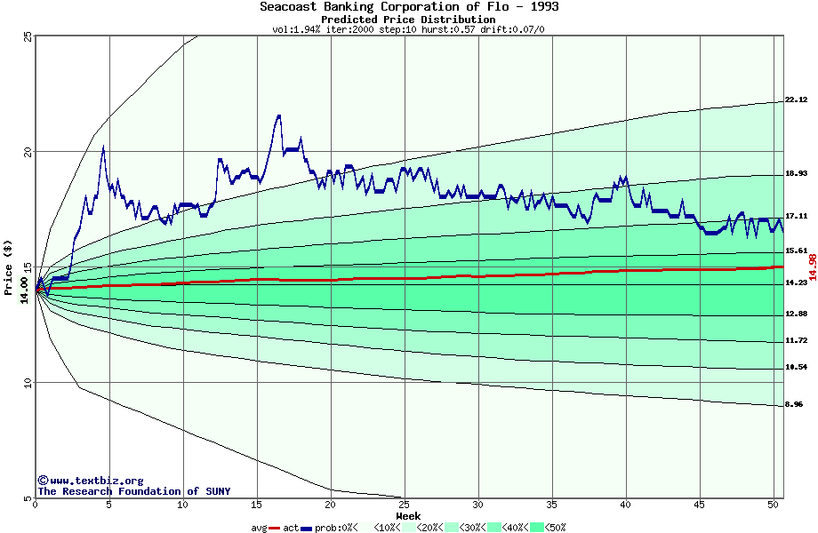 The following graph plots the year-to-date performance of the stock for 1993 compared to the probability calculated by a random walk model.
