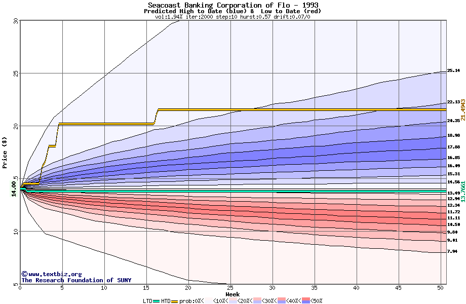 The high to date and low to date prices of the stock plotted against a random walk model for 1993 (what's this?).