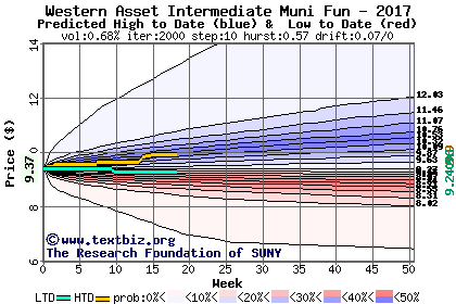The high to date and low to date prices of the stock plotted against a random walk model for 2017 (what's this?).