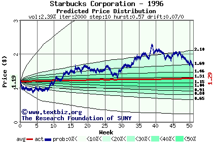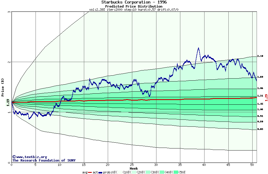 The following graph plots the year-to-date performance of the stock for 1996 compared to the probability calculated by a random walk model.