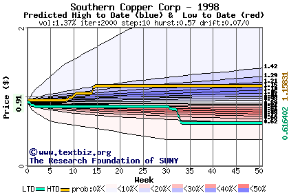 The high to date and low to date prices of the stock plotted against a random walk model for 1998 (what's this?).