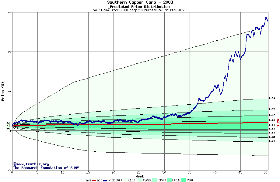 The following graph plots the year-to-date performance of the stock for 2003 compared to the probability calculated by a random walk model.