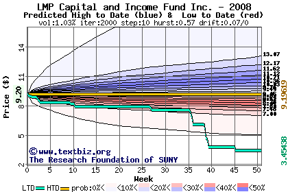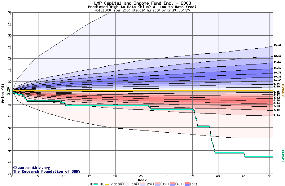 The high to date and low to date prices of the stock plotted against a random walk model for 2008 (what's this?).
