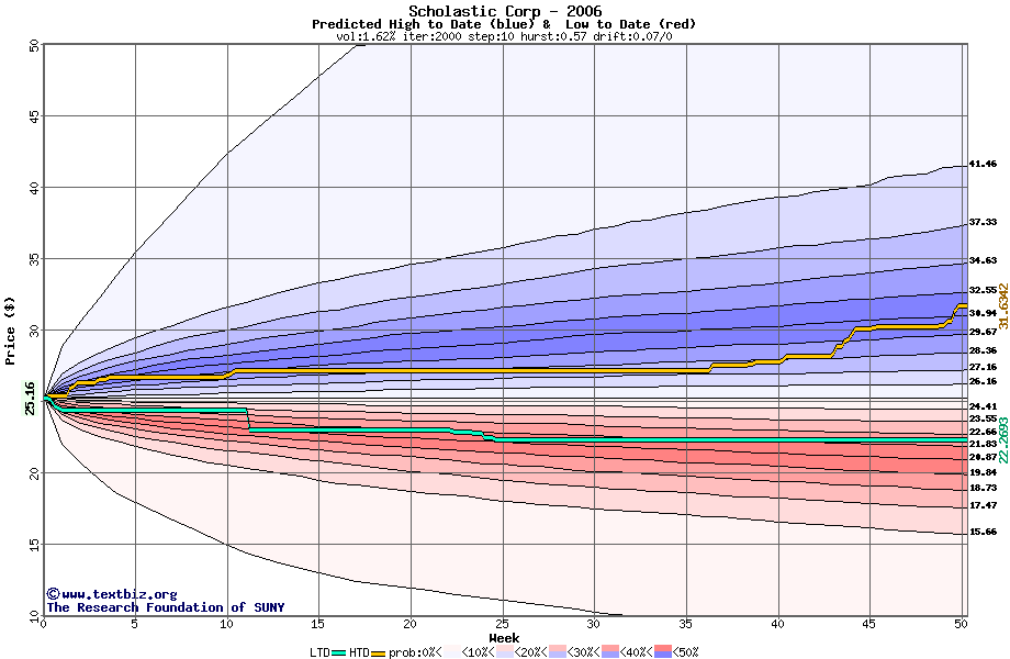 The high to date and low to date prices of the stock plotted against a random walk model for 2006 (what's this?).