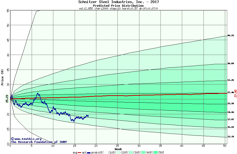 The following graph plots the year-to-date performance of the stock for 2017 compared to the probability calculated by a random walk model.