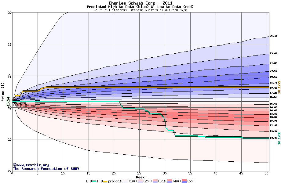The high to date and low to date prices of the stock plotted against a random walk model for 2011 (what's this?).