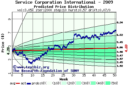The high to date and low to date prices of the stock plotted against a random walk model for 2009 (what's this?).