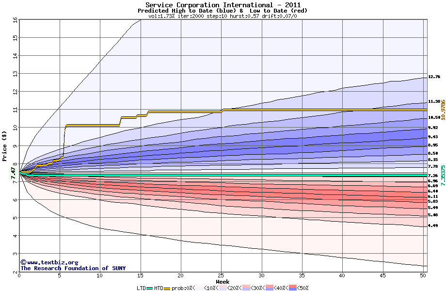 The high to date and low to date prices of the stock plotted against a random walk model for 2011 (what's this?).
