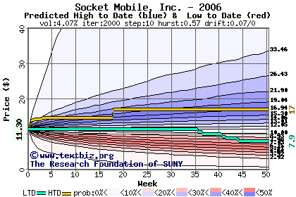 The high to date and low to date prices of the stock plotted against a random walk model for 2006 (what's this?).