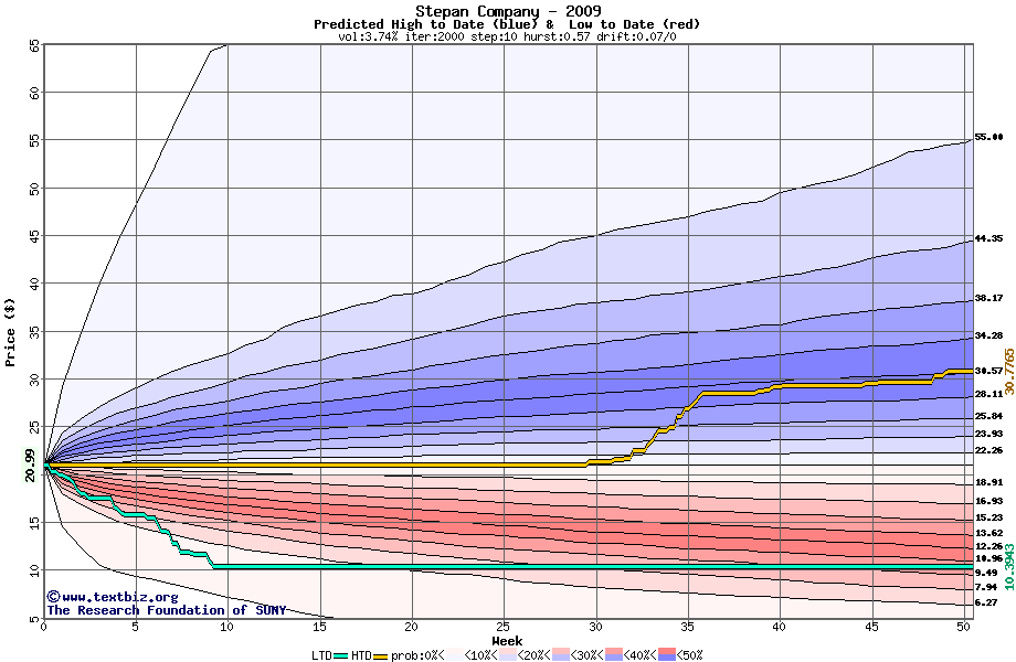 The following graph plots the year-to-date performance of the stock for 2009 compared to the probability calculated by a random walk model.