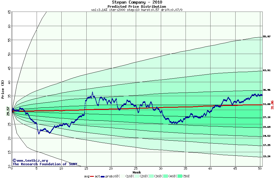 The following graph plots the year-to-date performance of the stock for 2010 compared to the probability calculated by a random walk model.