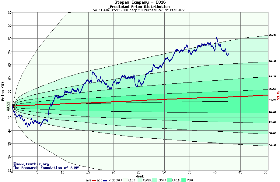 The following graph plots the year-to-date performance of the stock for 2016 compared to the probability calculated by a random walk model.