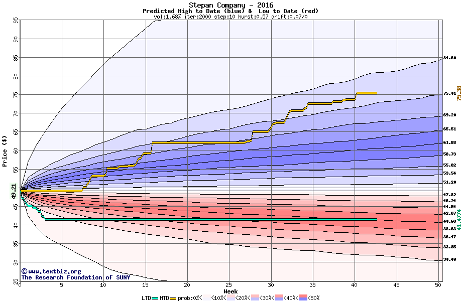 The high to date and low to date prices of the stock plotted against a random walk model for 2016 (what's this?).