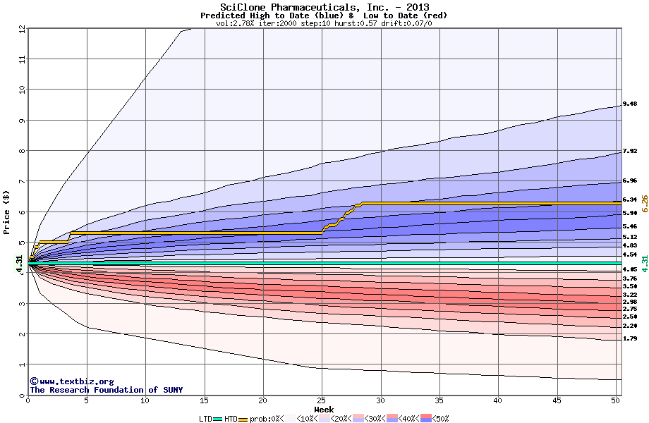 The high to date and low to date prices of the stock plotted against a random walk model for 2013 (what's this?).
