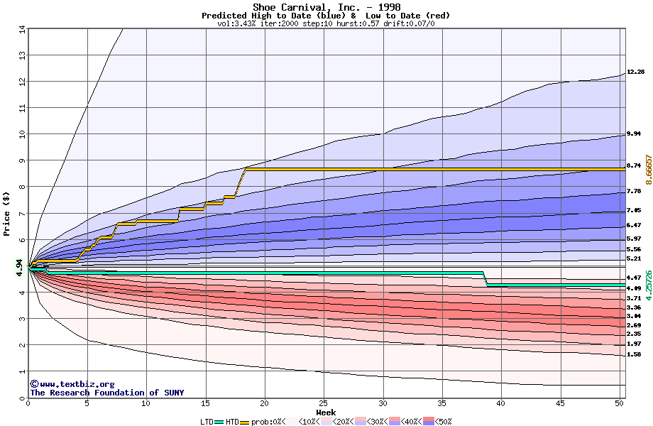 The high to date and low to date prices of the stock plotted against a random walk model for 1998 (what's this?).