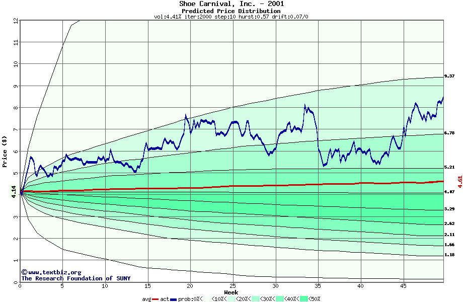 The following graph plots the year-to-date performance of the stock for 2001 compared to the probability calculated by a random walk model.