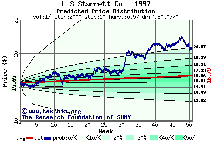 The high to date and low to date prices of the stock plotted against a random walk model for 1997 (what's this?).