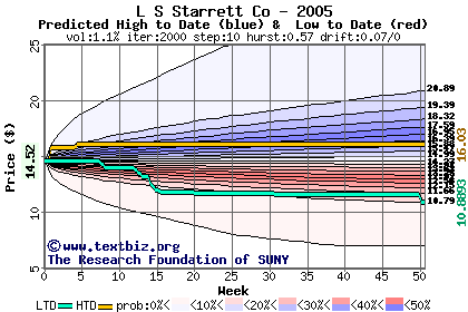 The high to date and low to date prices of the stock plotted against a random walk model for 2005 (what's this?).