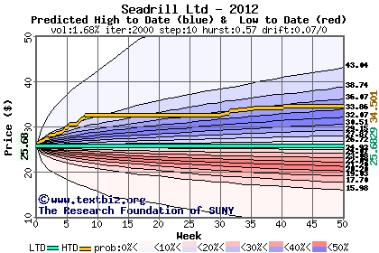 The high to date and low to date prices of the stock plotted against a random walk model for 2012 (what's this?).