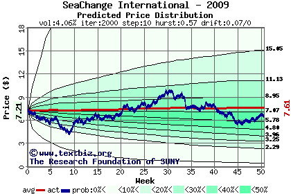 The following graph plots the year-to-date performance of the stock for 2009 compared to the probability calculated by a random walk model.