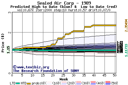 The high to date and low to date prices of the stock plotted against a random walk model for 1989 (what's this?).