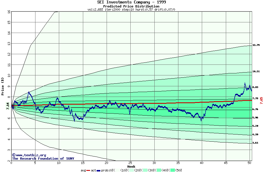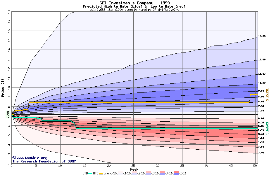 The high to date and low to date prices of the stock plotted against a random walk model for 1999 (what's this?).