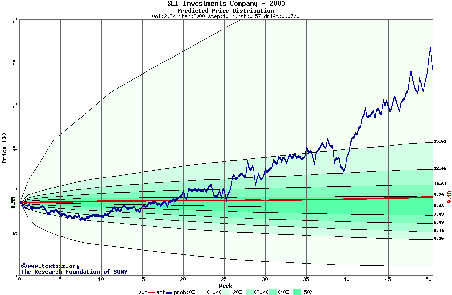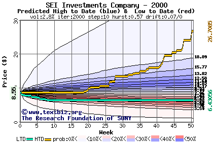 The high to date and low to date prices of the stock plotted against a random walk model for 2000 (what's this?).