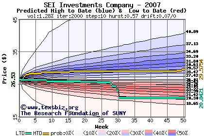 The high to date and low to date prices of the stock plotted against a random walk model for 2007 (what's this?).