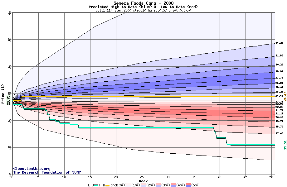 The high to date and low to date prices of the stock plotted against a random walk model for 2008 (what's this?).