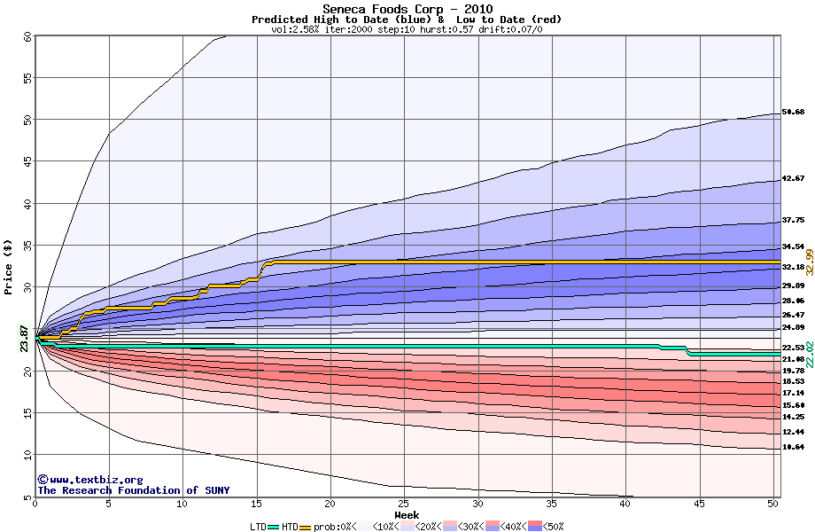 The high to date and low to date prices of the stock plotted against a random walk model for 2010 (what's this?).