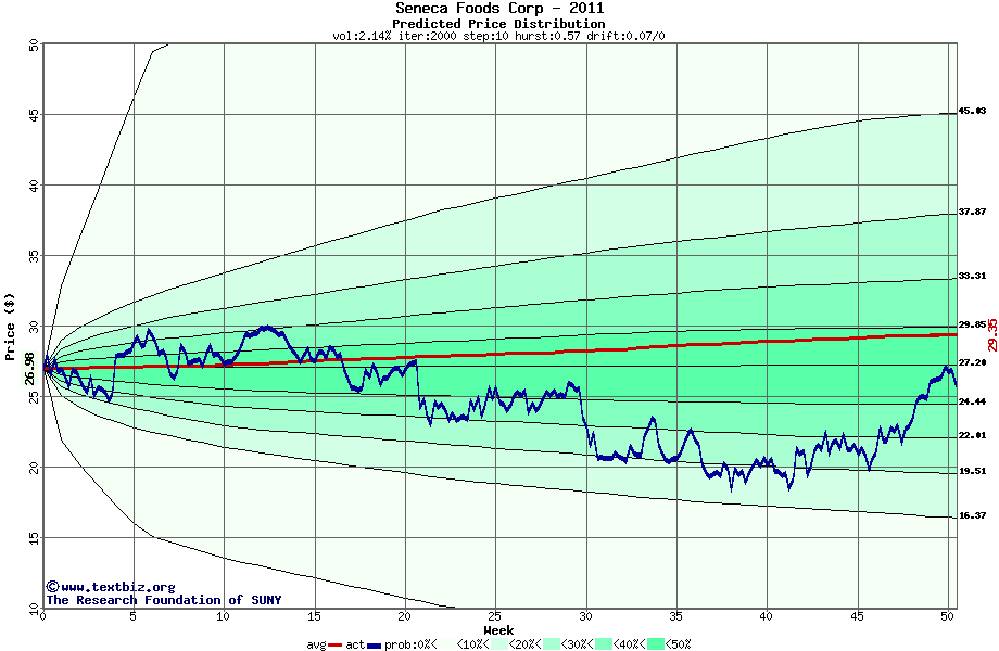 The high to date and low to date prices of the stock plotted against a random walk model for 2011 (what's this?).