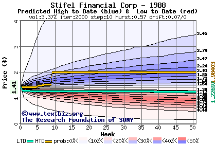 The high to date and low to date prices of the stock plotted against a random walk model for 1988 (what's this?).