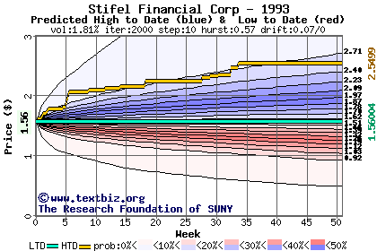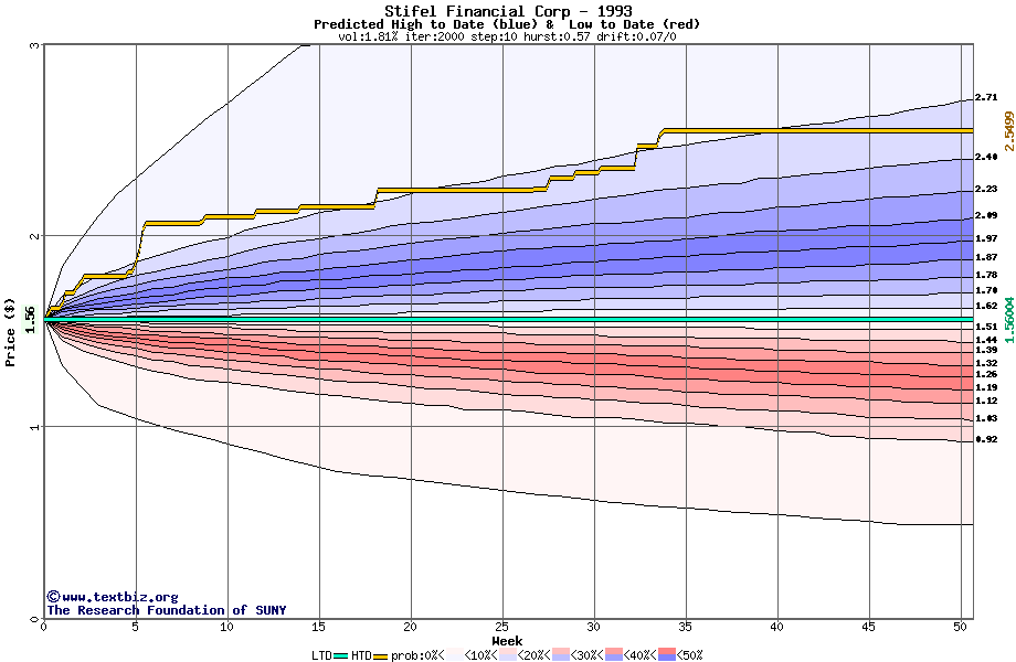 The high to date and low to date prices of the stock plotted against a random walk model for 1993 (what's this?).
