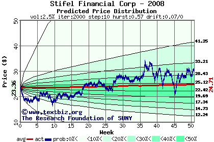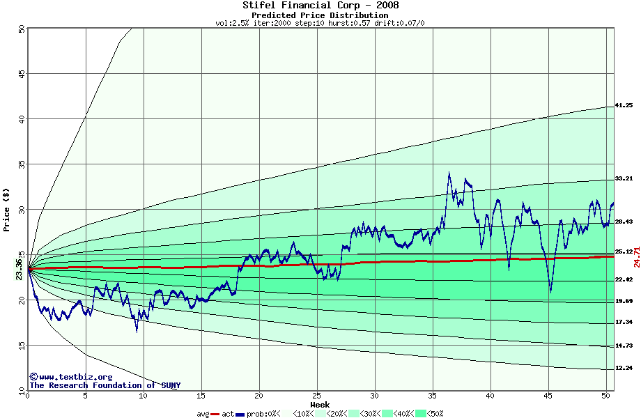 The following graph plots the year-to-date performance of the stock for 2008 compared to the probability calculated by a random walk model.