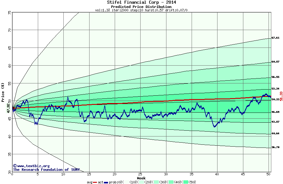 The following graph plots the year-to-date performance of the stock for 2014 compared to the probability calculated by a random walk model.