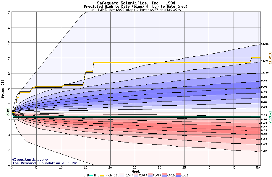 The high to date and low to date prices of the stock plotted against a random walk model for 1994 (what's this?).