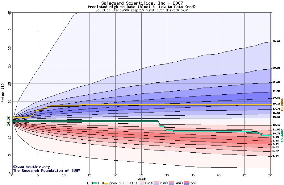 The high to date and low to date prices of the stock plotted against a random walk model for 2007 (what's this?).