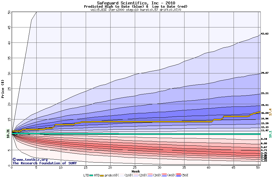 The high to date and low to date prices of the stock plotted against a random walk model for 2010 (what's this?).