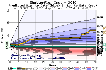 The high to date and low to date prices of the stock plotted against a random walk model for 2010 (what's this?).